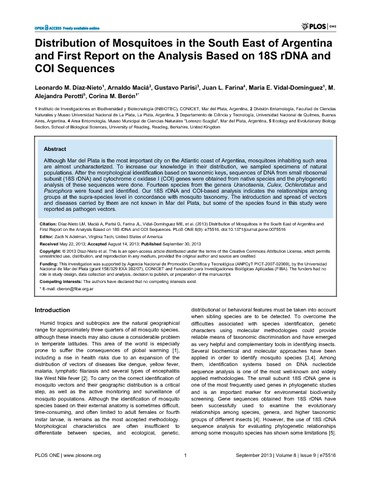 Distribution of mosquitoes in the South East of Argentina and first report on the analysis based on 18S rDNA and COI sequences