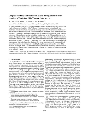 Costa, A., Wadge, G., Stewart, R. and Odbert, H. (2013) Coupled subdaily and multiweek cycles during the lava dome erupt of Soufriere Hills Volcano, Montserrat. Journal of Geophysical Research. Solid Earth, 118 (5). pp. 1895-1903. ISSN 2169-9356 doi: 10.1002/jgrb.50095
