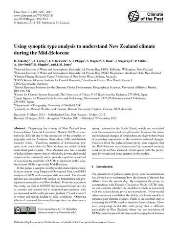 Ackerley, D., Lorrey, A., Renwick, J. A., Phipps, S. J., Wagner, S., Dean, S., Singarayer, J., Valdes, P., Abe-Ouchi, A., Ohgaito, R. and Jones, J. M. (2011) Using synoptic type analysis to understand New Zealand climate during the Mid-Holocene. Climate of the Past, 7 (4). pp. 1189-1207. ISSN 1814-9332 doi: 10.5194/cp-7-1189-2011