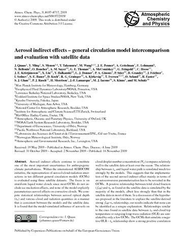 Quaas, J., Ming, Y., Menon, S., Takemura, T., Wang, M., Penner, J. E., Gettelman, A., Lohmann, U., Bellouin, N. orcid id iconORCID: https://orcid.org/0000-0003-2109-9559, Boucher, O., Sayer, A. M., Thomas, G. E., McComiskey, A., Feingold, G., Hoose, C., Kristjánsson, J. E., Liu, X., Balkanski, Y., Donner, L. J., Ginoux, P. A., Stier, P., Grandey, B., Feichter, J., Sednev, I., Bauer, S. E., Koch, D., Grainger, R. G., Kirkevåg, A., Iversen, T., Seland, Ø., Easter, R., Ghan, S. J., Rasch, P. J., Morrison, H., Lamarque, J.-F., Iacono, M. J., Kinne, S. and Schulz, M. (2009) Aerosol indirect effects – general circulation model intercomparison and evaluation with satellite data. Atmospheric Chemistry and Physics, 9 (22). pp. 8697-8717. ISSN 1680-7316 doi: 10.5194/acp-9-8697-2009