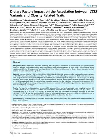 Hooton, H., Ängquist, L., Holst, C., Hager, J., Rousseau, F., Hansen, R. D., Tjønneland, A., Roswall, N., van der A, D. L., Overvad, K., Jakobsen, M. U., Boeing, H., Meidtner, K., Palli, D., Masala, G., Bouatia-Naji, N., Saris, W. H. M., Feskens, E. J. M., Wareham, N. J., Vimaleswaran, K. S. ORCID: https://orcid.org/0000-0002-8485-8930, Langin, D., Loos, R. J. F., Sørensen, T. I. A. and Clément, K.