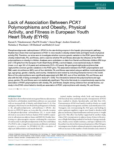 Lack of association between PCK1 polymorphisms and obesity, physical activity, and fitness in European Youth Heart Study (EYHS).