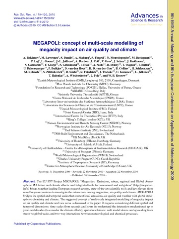 Baklanov, A., Lawrence, M., Pandis, S., Mahura, A., Finardi, S., Moussiopoulos, N., Beekmann, M., Laj, P., Gomes, L., Jaffrezo, J.-L., Borbon, A., Coll, I., Gros, V., Sciare, J., Kukkonen, J., Galmarini, S., Giorgi, F., Grimmond, S. orcid id iconORCID: https://orcid.org/0000-0002-3166-9415, Esau, I., Stohl, A., Denby, B., Wagner, T., Butler, T., Baltensperger, U., Builtjes, P., van den Hout, D., van der Gon, H. D., Collins, B., Schluenzen, H., Kulmala, M., Zilitinkevich, S., Sokhi, R., Friedrich, R., Theloke, J., Kummer, U., Jalkinen, L., Halenka, T., Wiedensholer, A., Pyle, J. and Rossow, W. B. (2010) MEGAPOLI: concept of multi-scale modelling of megacity impact on air quality and climate. Advances in Science and Research, 4. pp. 115-120. ISSN 1992-0636 doi: 10.5194/asr-4-115-2010