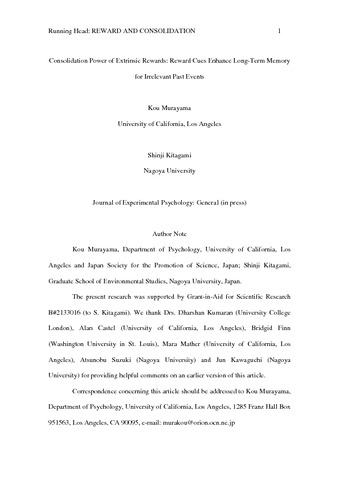 Murayama, K. and Kitagami, S. (2014) Consolidation power of extrinsic rewards: reward cues enhance long-term memory for irrelevant past events. Journal of Experimental Psychology: General, 143 (1). pp. 15-20. ISSN 1939-2222 doi: 10.1037/a0031992