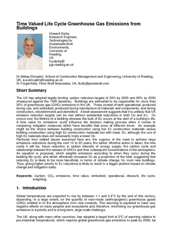 The UK has adopted legally binding carbon reduction targets of 34% by 2020 and 80% by 2050 (measured against the 1990 baseline). Buildings are estimated to be responsible for more than 50% of greenhouse gas (GHG) emissions in the UK. These consist of both operational, produced during use, and embodied, produced during manufacture of materials and components, and during construction, refurbishments and demolition. A brief assessment suggests that it is unlikely that UK emission reduction targets can be met without substantial reductions in both Oc and Ec. Oc occurs over the lifetime of a building whereas the bulk of Ec occurs at the start of a building’s life. A time value for emissions could influence the decision making process when it comes to comparing mitigation measures which have benefits that occur at different times. An example might be the choice between building construction using low Ec construction materials versus building construction using high Ec construction materials but with lower Oc, although the use of high Ec materials does not necessarily imply a lower Oc. Particular time related issues examined here are: the urgency of the need to achieve large emissions reductions during the next 10 to 20 years; the earlier effective action is taken, the less costly it will be; future reduction in carbon intensity of energy supply; the carbon cycle and relationship between the release of GHG’s and their subsequent concentrations in the atmosphere. An equation is proposed, which weights emissions according to when they occur during the building life cycle, and which effectively increases Ec as a proportion of the total, suggesting that reducing Ec is likely to be more beneficial, in terms of climate change, for most new buildings. Thus, giving higher priority to Ec reductions is likely to result in a bigger positive impact on climate change and mitigation costs.