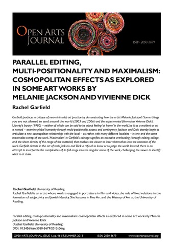 Parallel editing, multi-positionality and maximalism: cosmopolitan effects as explored in some art works by Melanie Jackson and Vivienne Dick.