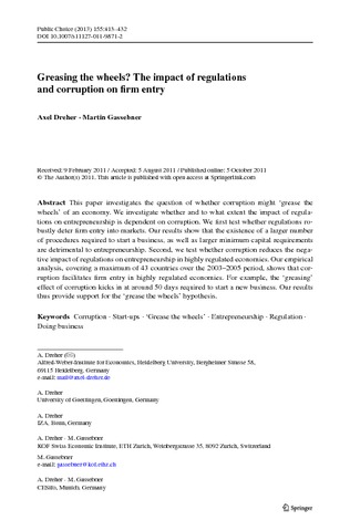 Dreher, A. and Gassebner, M. (2013) Greasing the wheels? The impact of regulations and corruption on firm entry. Public Choice, 155 (3-4). pp. 413-432. ISSN 0048-5829 doi: 10.1007/s11127-011-9871-2