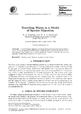A model of species migration is presented which takes the form of a reaction-diffusion system. We consider special limits of this model in which we demonstrate the existence of travelling wave solutions. These solutions can be used to describe the migration of cells, bacteria, and some organisms. © 2000 Elsevier Science Ltd. All rights reserved.