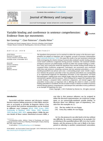 Variable binding and coreference in sentence comprehension: evidence from eye movements.