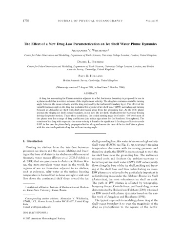 A drag law accounting for Ekman rotation adjacent to a flat, horizontal bou ndary is proposed for use in a plume model that is written in terms of the depth-mean velocity. The drag l aw contains a variable turning angle between the mean velocity and the drag imposed by the turbulent bound ary layer. The effect of the variable turning angle in the drag law is studied for a plume of ice shelf wat er (ISW) ascending and turning beneath an Antarctic ice shelf with draft decreasing away from the groundi ng line. As the ISW plume ascends the sloping ice shelf–ocean boundary, it can melt the ice shelf, wh ich alters the buoyancy forcing driving the plume motion. Under these conditions, the typical turning ang le is of order 10° over most of the plume area for a range of drag coefficients (the minus sign arises for th e Southern Hemisphere). The rotation of the drag with respect to the mean velocity is found to be signifi cant if the drag coefficient exceeds 0.003; in this case the plume body propagates farther along and across the b ase of the ice shelf than a plume with the standard quadratic drag law with no turning angle.