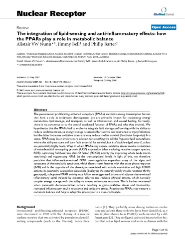 Nunn, A. V.W., Bell, J. and Barter, P. (2007) The integration of lipid-sensing and anti-inflammatory effects: how the PPARs play a role in metabolic balance. Nuclear receptor, 5 (1). ISSN 1478-1336 doi: 10.1186/1478-1336-5-1