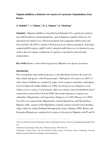 Mapania multiflora is described and illustrated. It is vegetatively similar to taxa with broad leaves and pseudopetioles, such as M. cuspidata. However, it is reproductively similar to sect. Thoractostachyum with a paniculate inflorescence and furrowed fruit. The DNA is similar to M. bancana in sect. Thoractostachyum, in the three sampled cpDNA regions: atpH-F, trnL-F and psbA-trnH. However, it is identical to none of these due to its unique combination of vegetative, reproductive and molecular characteristics.