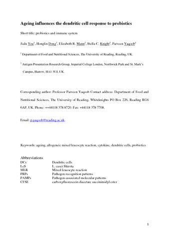 | Uncontrolled Keywords | Ageing; Allogeneic mixed leucocyte reaction; Cytokine; Dendritic cells; Probiotics |