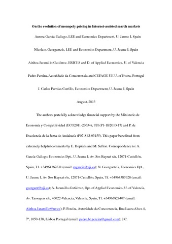 García-Gallego, A., Georgantzis, N., Jaramillo-Gutiérrez, A., Pereira, P. and Pernias-Cerrillo, J. C. (2014) On the evolution of monopoly pricing in Internet-assisted search markets. Journal of Business Research, 67 (5). pp. 795-801. ISSN 0148-2963 doi: 10.1016/j.jbusres.2013.11.047