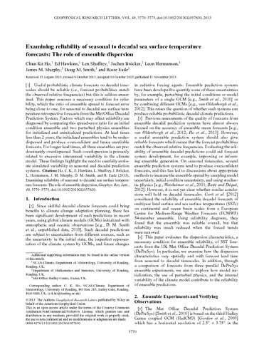 Ho, C. K., Hawkins, E. orcid id iconORCID: https://orcid.org/0000-0001-9477-3677, Shaffrey, L. orcid id iconORCID: https://orcid.org/0000-0003-2696-752X, Bröcker, J., Hermanson, L., Murphy, J. M., Smith, D. M. and Eade, R. (2013) Examining reliability of seasonal to decadal sea surface temperature forecasts: the role of ensemble dispersion. Geophysical Research Letters, 40 (21). pp. 5770-5775. ISSN 0094-8276 doi: 10.1002/2013GL057630