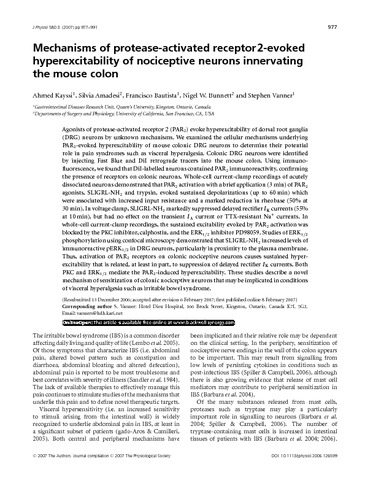 Kayssi, A., Amadesi, S., Bautista, F., Bunnett, N. W. and Vanner, S. (2007) Mechanisms of protease-activated receptor 2-evoked hyperexcitability of nociceptive neurons innervating the mouse colon. Journal of Physiology, 580 (3). pp. 977-991. ISSN 0022-3751 doi: 10.1113/jphysiol.2006.126599