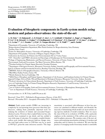 Foley, A. M., Dalmonech, D., Friend, A. .D., Aires, F., Archibald, A., Bartlein, P. J., Bopp, L., Chappellaz, J., Cox, P., Edwards, N. R., Feulner, G., Friedlingstein, P., Harrison, S. P. orcid id iconORCID: https://orcid.org/0000-0001-5687-1903, Hopcroft, P. O., Jones, C. D., Kolassa, J., Levine, J., Prentice, I. C., Pyle, J., Vasquez Riveiros, N., Wolff, E. and Zaele, S. (2013) Evaluation of biospheric components in Earth system models using modern and palaeo-observations: the state-of-the-art. Biogeosciences, 10 (12). pp. 8305-8328. ISSN 1810-6285 doi: 10.5194/bg-10-8305-2013