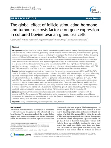 Glister, C., Hatzirodos, N., Hummitzsch, K., Knight, P. G. orcid id iconORCID: https://orcid.org/0000-0003-0300-1554 and Rodgers, R. J. (2014) The global effect of follicle-stimulating hormone and tumour necrosis factor α on gene expression in cultured bovine ovarian granulosa cells. BMC Genomics, 15 (1). 72. ISSN 1471-2164 doi: 10.1186/1471-2164-15-72