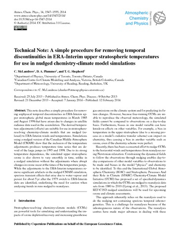 Technical note: a simple procedure for removing temporal discontinuities in ERA-Interim upper stratospheric temperatures for use in nudged chemistry-climate model simulations.