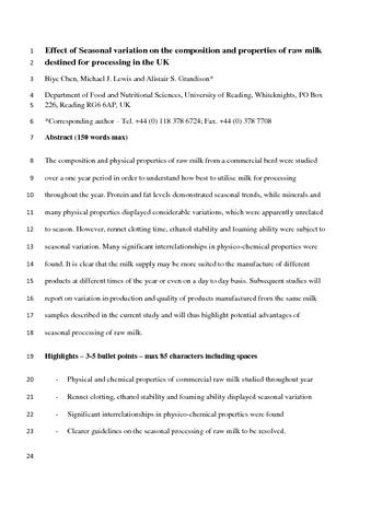 Chen, B., Lewis, M. and Grandison, A. (2014) Effect of seasonal variation on the composition and properties of raw milk destined for processing in the UK. Food Chemistry, 158. pp. 216-223. ISSN 0308-8146 doi: 10.1016/j.foodchem.2014.02.118