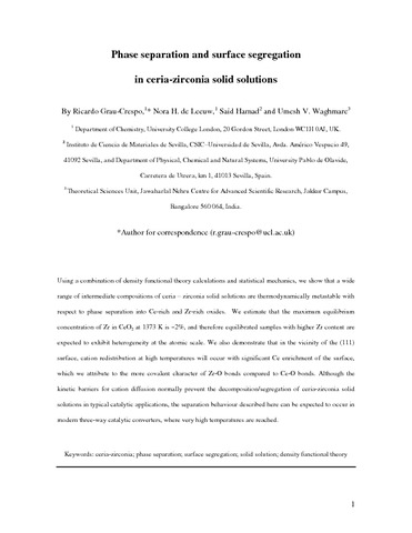 Grau-Crespo, R. orcid id iconORCID: https://orcid.org/0000-0001-8845-1719, de Leeuw, N. H., Hamad, S. and Waghmare, U. V. (2011) Phase separation and surface segregation in ceria-zirconia solid solutions. Proceedings of the Royal Society A: Mathematical, Physical and Engineering Sciences, 467 (2131). pp. 1925-1938. ISSN 1364-5021 doi: 10.1098/rspa.2010.0512