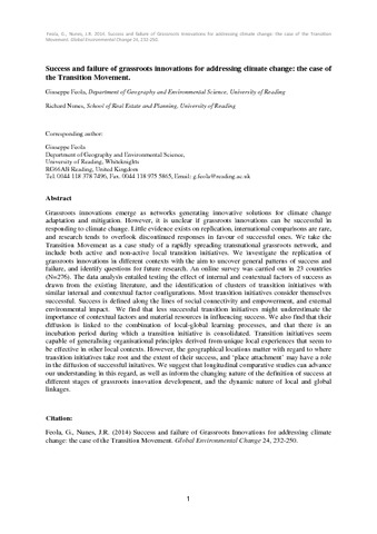 Grassroots innovations emerge as networks generating innovative solutions for climate change adaptation and mitigation. However, it is unclear if grassroots innovations can be successful in responding to climate change. Little evidence exists on replication, international comparisons are rare, and research tends to overlook discontinued responses in favour of successful ones. We take the Transition Movement as a case study of a rapidly spreading transnational grassroots network, and include both active and non-active local transition initiatives. We investigate the replication of grassroots innovations in different contexts with the aim to uncover general patterns of success and failure, and identify questions for future research. An online survey was carried out in 23 countries (N=276). The data analysis entailed testing the effect of internal and contextual factors of success as drawn from the existing literature, and the identification of clusters of transition initiatives with similar internal and contextual factor configurations. Most transition initiatives consider themselves successful. Success is defined along the lines of social connectivity and empowerment, and external environmental impact. We find that less successful transition initiatives might underestimate the importance of contextual factors and material resources in influencing success. We also find that their diffusion is linked to the combination of local-global learning processes, and that there is an incubation period during which a transition initiative is consolidated. Transition initiatives seem capable of generalising organisational principles derived from unique local experiences that seem to be effective in other local contexts. However, the geographical locations matter with regard to where transition initiatives take root and the extent of their success, and ‘place attachment’ may have a role in the diffusion of successful initatives. We suggest that longitudinal comparative studies can advance our understanding in this regard, as well as inform the changing nature of the definition of success at different stages of grassroots innovation development, and the dynamic nature of local and global linkages.