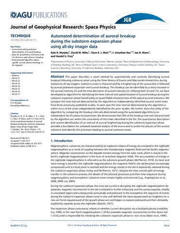 Murphy, K. R., Miles, D. M., Watt, C. E.J., Rae, I. J., Mann, I. R. and Frey, H. U. (2014) Automated determination of auroral breakup during the substorm expansion phase using all sky imager data. Journal of Geophysical Research: Space Physics, 119 (2). pp. 1414-1427. ISSN 2169-9402 doi: 10.1002/2013JA018773