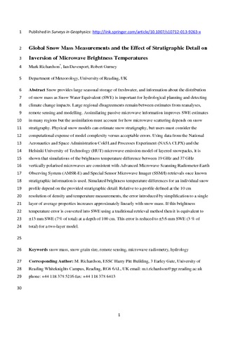Richardson, M., Davenport, I. and Gurney, R. (2013) Global snow mass measurements and the effect of stratigraphic detail on inversion of microwave brightness temperatures. Surveys in Geophysics, 35 (3). pp. 785-812. ISSN 0169-3298 doi: 10.1007/s10712-013-9263-x