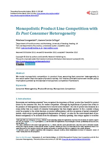 Georgantzis, N. and García-Gallego, A. (2014) Monopolistic product line competition with ex post consumer heterogeneity. Theoretical Economics Letters, 04 (02). pp. 155-165. ISSN 2162-2086 doi: 10.4236/tel.2014.42023