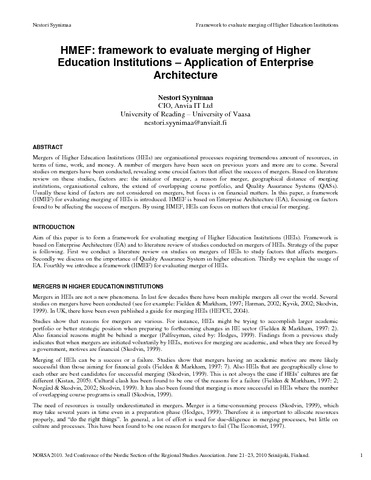 Syynimaa, N. (2010) HMEF: framework to evaluate merging of Higher Education Institutions – application of Enterprise Architecture. In: NORSA 2010, 3rd Conference of the Nordic Section of the Regional Studies Association, 21 - 23 June 2010, Seinäjoki, Finland.