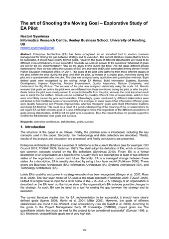 Syynimaa, N. (2012) The art of shooting the moving goal - explorative study of EA pilot. In: 6th European Conference on Information Management and Evaluation, 13- 14 September 2012, Cork, Ireland.