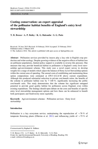 Costing conservation: an expert appraisal of the pollinator habitat benefits of England’s entry level stewardship.