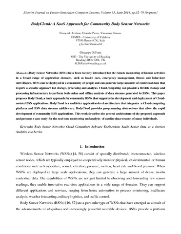 Fortino, G., Parisi, D., Pirrone, V. and Di Fatta, G. (2014) BodyCloud: a SaaS approach for community body sensor networks. Future Generation Computer Systems, 35. pp. 62-79. ISSN 0167-739X doi: 10.1016/j.future.2013.12.015