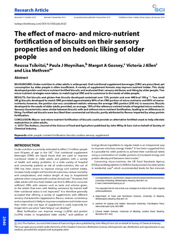 Tsikritzi, R., Moynihan, P. J., Gosney, M. A., Allen, V. J. and Methven, L. (2014) The effect of macro and micro-nutrient fortification of biscuits on their sensory properties and on hedonic liking of older people. Journal of the Science of Food and Agriculture, 94 (10). pp. 2040-2048. ISSN 0022-5142 doi: 10.1002/jsfa.6522