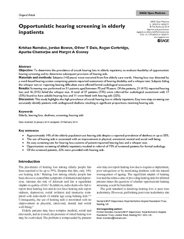 Ramdoo, K., Bowen, J., Dale, O. T., Corbridge, R., Chatterjee, A. and Gosney, M. A. (2014) Opportunistic assessment of hearing in elderly inpatients. Sage Open Medicine, 2. ISSN 2158-2440 doi: 10.1177/2050312114528171