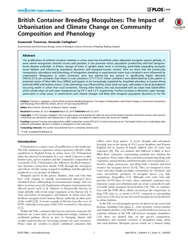 The proliferation of artificial container habitats in urban areas has benefitted urban adaptable mosquito species globally. In areas where mosquitoes transmit viruses and parasites, it can promote vector population productivity and fuel mosquito-borne disease outbreaks. In Britain, storage of water in garden water butts is increasing, potentially expanding mosquito larval habitats and influencing population dynamics and mosquito-human contact. Here we show that the community composition, abundance and phenology of mosquitoes breeding in experimental water butt containers were influenced by urbanisation. Mosquitoes in urban containers were less species-rich but present in significantly higher densities (100.4±21.3) per container than those in rural containers (77.7±15.1). Urban containers were dominated by Culex pipiens (a potential vector of West Nile Virus [WNV]) and appear to be increasingly exploited by Anopheles plumbeus (a human-biting potential WNV and malaria vector). Culex phenology was influenced by urban land use type, with peaks in larval abundances occurring earlier in urban than rural containers. Among other factors, this was associated with an urban heat island effect which raised urban air and water temperatures by 0.9°C and 1.2°C respectively. Further increases in domestic water storage, particularly in urban areas, in combination with climate changes will likely alter mosquito population dynamics in the UK.