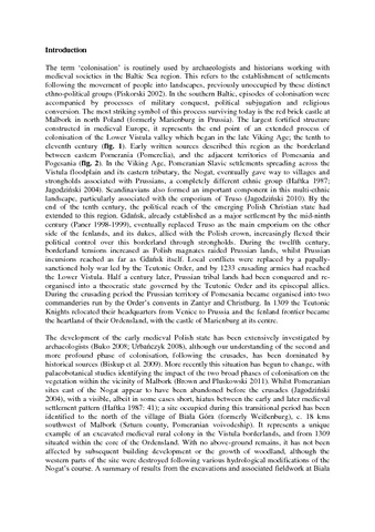 Between the eleventh and thirteenth centuries AD, the Lower Vistula valley represented a permeable and shifting frontier between Pomerelia (eastern Pomerania), which had been incorporated into the Polish Christian state by the end of the tenth century, and the territories of western Prussian tribes, who had resisted attempts at Christianization. Pomeranian colonization eventually began to falter in the latter decades of the twelfth and early thirteenth centuries, most likely as a result of Prussian incursions, which saw the abandonment of sites across the borderland. Subsequently, the Teutonic Order and its allies led a protracted holy war against the Prussian tribes, which resulted in the conquest of the region and its incorporation into a theocratic state by the end of the thirteenth century. This was accompanied by a second wave of colonization, which resulted in the settlement pattern that is still visible in the landscape of north-central Poland today. However, not all colonies were destroyed or abandoned in between the two phases of colonization. The recently excavated site of Biała Góra, situated on the western side of the Forest of Sztum overlooking the River Nogat, represents a unique example of a transitional settlement that included both Pomeranian and Teutonic Order phases. The aim of this paper is to situate the site within its broader landscape context which can be characterized as a militarized frontier, where, from the later twelfth century and throughout much of the thirteenth century, political and economic expansion was combined with the ideology of Christian holy war and missionary activity. This paper considers how the colonists provisioned and sustained themselves in comparison to other sites within the region, and how Biała Góra may be tentatively linked to a documented but otherwise lost outpost in this volatile borderland.