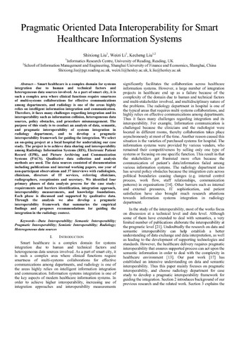 Smart healthcare is a complex domain for systems integration due to human and technical factors and heterogeneous data sources involved. As a part of smart city, it is such a complex area where clinical functions require smartness of multi-systems collaborations for effective communications among departments, and radiology is one of the areas highly relies on intelligent information integration and communication. Therefore, it faces many challenges regarding integration and its interoperability such as information collision, heterogeneous data sources, policy obstacles, and procedure mismanagement. The purpose of this study is to conduct an analysis of data, semantic, and pragmatic interoperability of systems integration in radiology department, and to develop a pragmatic interoperability framework for guiding the integration. We select an on-going project at a local hospital for undertaking our case study. The project is to achieve data sharing and interoperability among Radiology Information Systems (RIS), Electronic Patient Record (EPR), and Picture Archiving and Communication Systems (PACS). Qualitative data collection and analysis methods are used. The data sources consisted of documentation including publications and internal working papers, one year of non-participant observations and 37 interviews with radiologists, clinicians, directors of IT services, referring clinicians, radiographers, receptionists and secretary. We identified four primary phases of data analysis process for the case study: requirements and barriers identification, integration approach, interoperability measurements, and knowledge foundations. Each phase is discussed and supported by qualitative data. Through the analysis we also develop a pragmatic interoperability framework that summaries the empirical findings and proposes recommendations for guiding the integration in the radiology context.