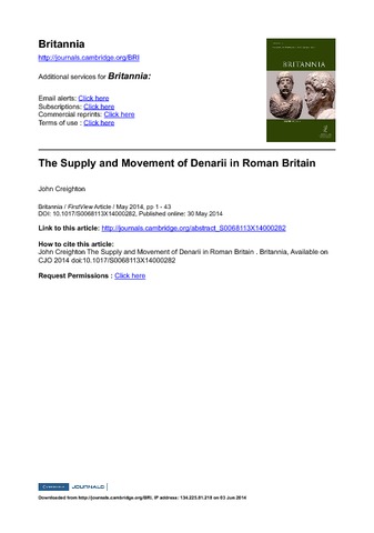 Creighton, J. orcid id iconORCID: https://orcid.org/0000-0002-4608-9202 (2014) The supply and movement of Denarii in Roman Britain. Britannia, 45. pp. 121-163. ISSN 1753-5352 doi: 10.1017/S0068113X14000282