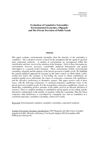 This paper evaluates environmental externality when the structure of the externality is cumulative. The evaluation exercise is based on the assumption that the agents in question form conjectural variations. A number of environments are encompassed within this classification and have received due attention in the literature. Each of these heterogeneous environments, however, possesses considerable analytical homogeneity and permit subscription to a general model treatment. These environments include environmental externality, oligopoly and the analysis of the private provision of public goods. We highlight the general analytical approach by focusing on this latter context, in which debate centers around four issues: the existence of free-riding, the extent to which contributions are matched equally across individuals, the nature of conjectures consistent with equilibrium, and the allocative inefficiency of alternative regimes. This paper resolves each of these issues, with the following conclusions: A consistent-conjectures equilibrium exists in the private provision of public goods. It is the monopolistic-conjectures equilibrium. Agents act identically, contributing positive amounts of the public good in an efficient allocation of resources. There is complete matching of contributions among agents, no free-riding, and the allocation is independent of the number of members within the community. Thus the Olson conjecture—that inefficiency is exacerbated by community size—has no foundation in a consistent-conjectures, cumulative-externality, context (212 words).