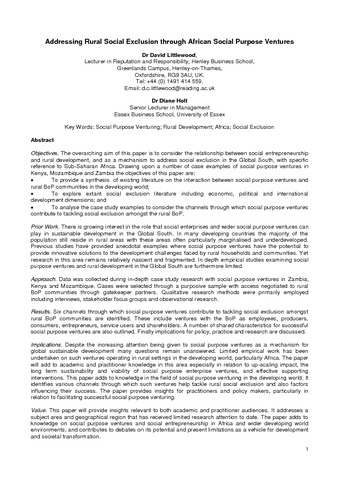 Littlewood, D. and Holt, D. (2013) Addressing rural social exclusion through African social purpose ventures. In: 36th ISBE Conference, 12-13th November, Cardiff.