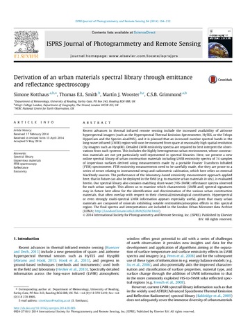 Kotthaus, S., Smith, T. E.L., Wooster, M. J. and Grimmond, C. S. B. orcid id iconORCID: https://orcid.org/0000-0002-3166-9415 (2014) Derivation of an urban materials spectral library through emittance and reflectance spectroscopy. ISPRS Journal of Photogrammetry and Remote Sensing, 94. pp. 194-212. ISSN 0924-2716 doi: 10.1016/j.isprsjprs.2014.05.005