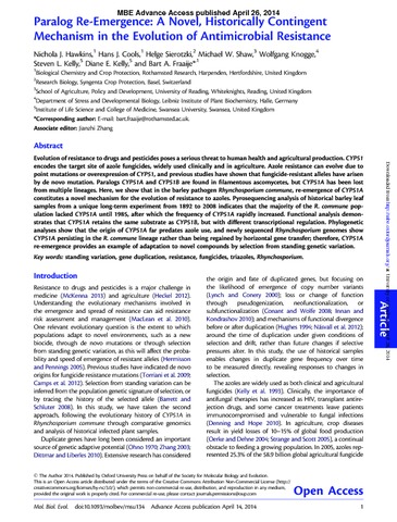 Hawkins, N. J., Cools, H. J., Sierotski, H., Shaw, M. W., Knogge, W., Kelly, S. L., Kelly, D. E. and Fraaije, B. A. (2014) Paralog re-emergence: a novel, historically contingent mechanism in the evolution of antimicrobial resistance. Molecular Biology and Evolution, 31 (7). pp. 1793-1802. ISSN 1537-1719 doi: 10.1093/molbev/msu134