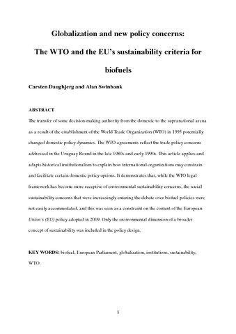 Daugbjerg, C. and Swinbank, A. orcid id iconORCID: https://orcid.org/0000-0003-2526-2026 (2014) Globalization and new policy concerns: the WTO and the EU's sustainability criteria for biofuels. Journal of European Public Policy, 22 (3). pp. 429-446. ISSN 1466-4429 doi: 10.1080/13501763.2014.927520
