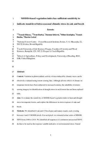Context: Variation in photosynthetic activity of trees induced by climatic stress can be effectively evaluated using remote sensing data. Although adverse effects of climate on temperate forests have been subjected to increased scrutiny, the suitability of remote sensing imagery for identification of drought stress in such forests has not been explored fully. Aim: To evaluate the sensitivity of MODIS-based vegetation index to heat and drought stress in temperate forests, and explore the differences in stress response of oaks and beech. Methods: We identified 8 oak and 13 beech pure and mature stands, each covering between 4 and 13 MODIS pixels. For each pixel, we extracted a time series of MODIS NDVI from 2000 to 2010. We identified all sequences of continuous unseasonal NDVI decline to be used as the response variable indicative of environmental stress. Neural Networks-based regression modelling was then applied to identify the climatic variables that best explain observed NDVI declines. Results: Tested variables explained 84–97% of the variation in NDVI, whilst air temperature-related climate extremes were found to be the most influential. Beech showed a linear response to the most influential climatic predictors, while oak responded in a unimodal pattern suggesting a better coping mechanism. Conclusions: MODIS NDVI has proved sufficiently sensitive as a stand-level indicator of climatic stress acting upon temperate broadleaf forests, leading to its potential use in predicting drought stress from meteorological observations and improving parameterisation of forest stress indices.