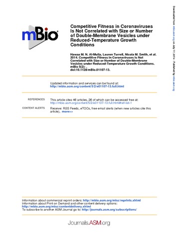 Al-Mulla, H. M. N., Turrell, L., Smith, N. M., Payne, L., Baliji, S., Züst, R., Thiel, V., Baker, S. C., Siddell, S. G. and Neuman, B. W. (2014) Competitive fitness in coronaviruses is not correlated with size or number of double-membrane vesicles under reduced-temperature growth conditions. mBio, 5 (2). e01107-13. ISSN 2150-7511 doi: 10.1128/mBio.01107-13