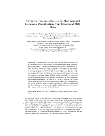 | Uncontrolled Keywords | Dementia, MRI, Multinominal classification, Feature selection |