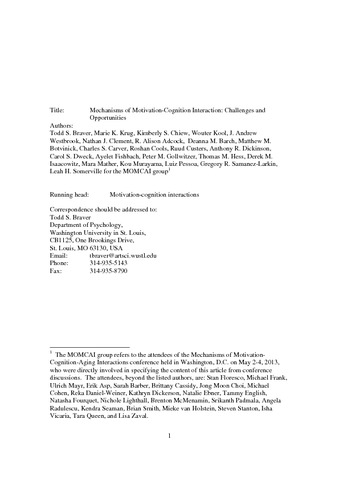 Braver, T. S., Krug, M. K., Chiew, K. S., Kool, W., Westbrook, A., Clement, N. J., Adcock, A., Barch, D., M., Botvinick, M. M., Carver, C. S., Cools, R., Custers, R., Dickinson, A. R., Dweck, C. S., Fishbach, A., Gollwitzer, P. M., Hess, T. M., Isaacowitz, D. M., Mather, M., Murayama, K., Pessoa, L., Samanez-Larkin, G. R. and Somerville, L. H. (2014) Mechanisms of motivation-cognition interaction: challenges and opportunities. Cognitive, Affective, & Behavioral Neuroscience, 14 (2). pp. 443-472. ISSN 1531-135X doi: 10.3758/s13415-014-0300-0