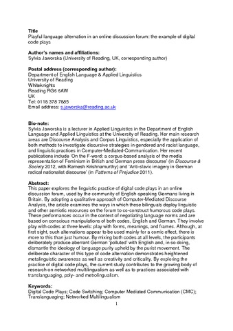This paper explores the linguistic practice of digital code plays in an online discussion forum, used by the community of English-speaking Germans living in Britain. By adopting a qualitative approach of Computer-Mediated Discourse Analysis, the article examines the ways in which these bilinguals deploy linguistic and other semiotic resources on the forum to co-construct humorous code plays. These performances occur in the context of negotiating language norms and are based on conscious manipulations of both codes, English and German. They involve play with codes at three levels: play with forms, meanings, and frames. Although, at first sight, such alternations appear to be used mainly for a comic effect, there is more to this than just humour. By mixing both codes at all levels, the participants deliberately produce aberrant German ‘polluted’ with English and, in so doing, dismantle the ideology of language purity upheld by the purist movement. The deliberate character of this type of code alternation demonstrates heightened metalinguistic awareness as well as creativity and criticality. By exploring the practice of digital code plays, the current study contributes to the growing body of research on networked multilingualism as well as to practices associated with translanguaging, poly- and metrolingualism.