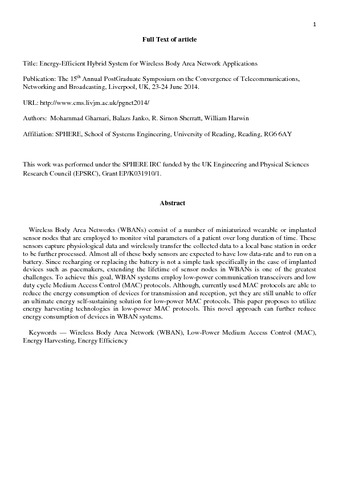 Ghamari, M., Janko, B., Sherratt, S. orcid id iconORCID: https://orcid.org/0000-0001-7899-4445 and Harwin, W. orcid id iconORCID: https://orcid.org/0000-0002-3928-3381 (2014) Energy-efficient hybrid system for Wireless Body Area Network Applications. In: The 15th Annual PostGraduate Symposium on the Convergence of Telecommunications, Networking and Broadcasting,, 23-24 June 2014., Liverpool, UK,.